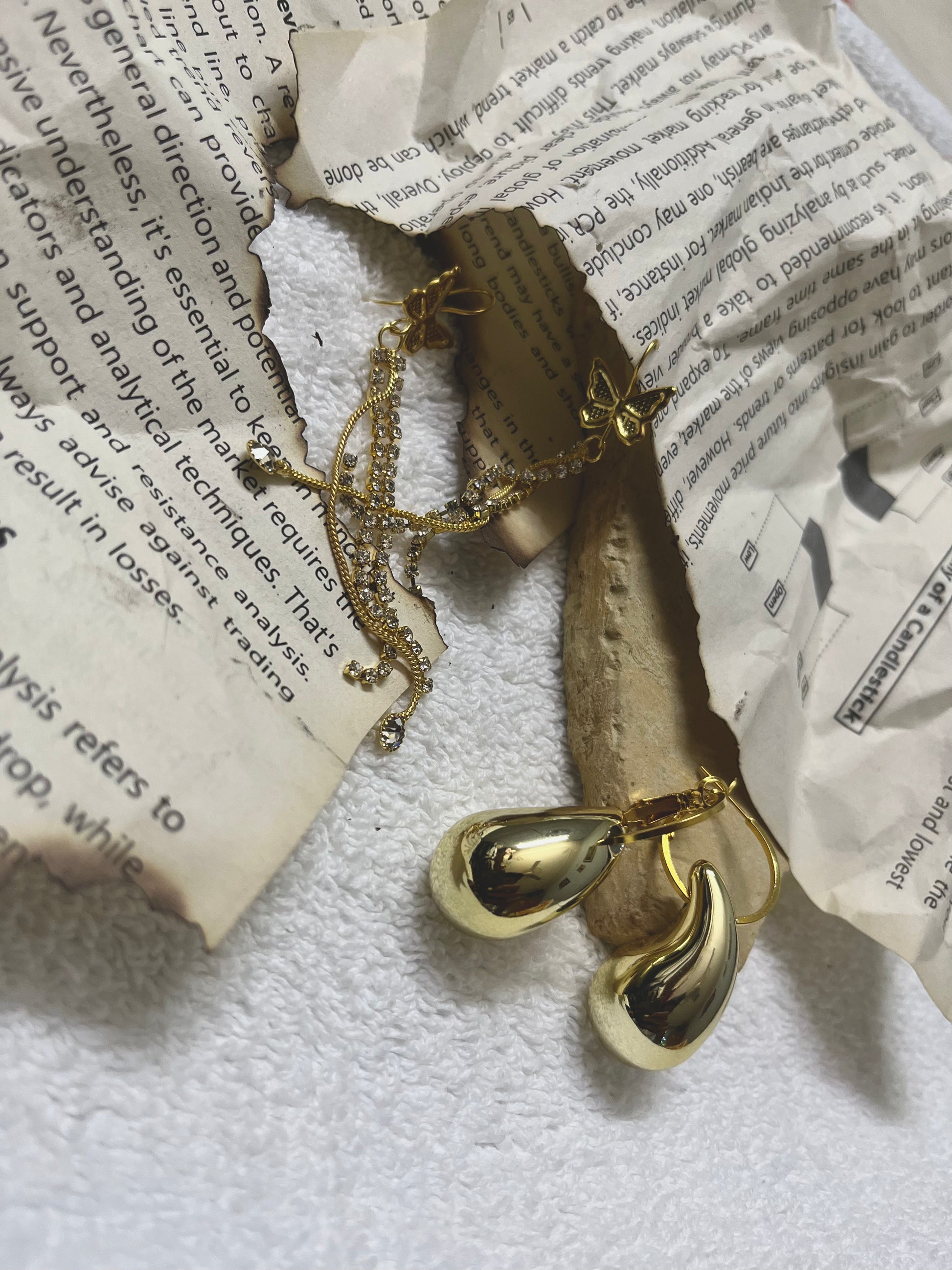 Embrace the beauty of classic design with a modern twist. The highlight is the textured dome jhumka on a crystal-studded hoop, offering a rich, ethnic flair. Complementing this is the delicate butterfly chain earring, which adds a touch of sparkle and movement. Perfect for festive occasions, weddings, or adding a cultural touch to your wardrobe.