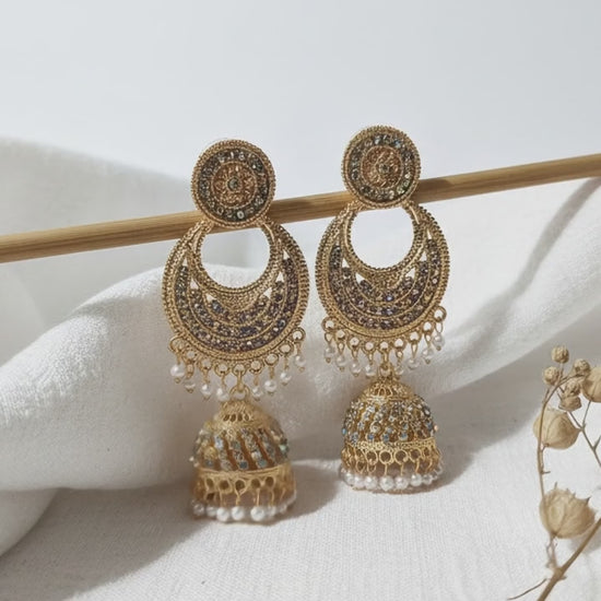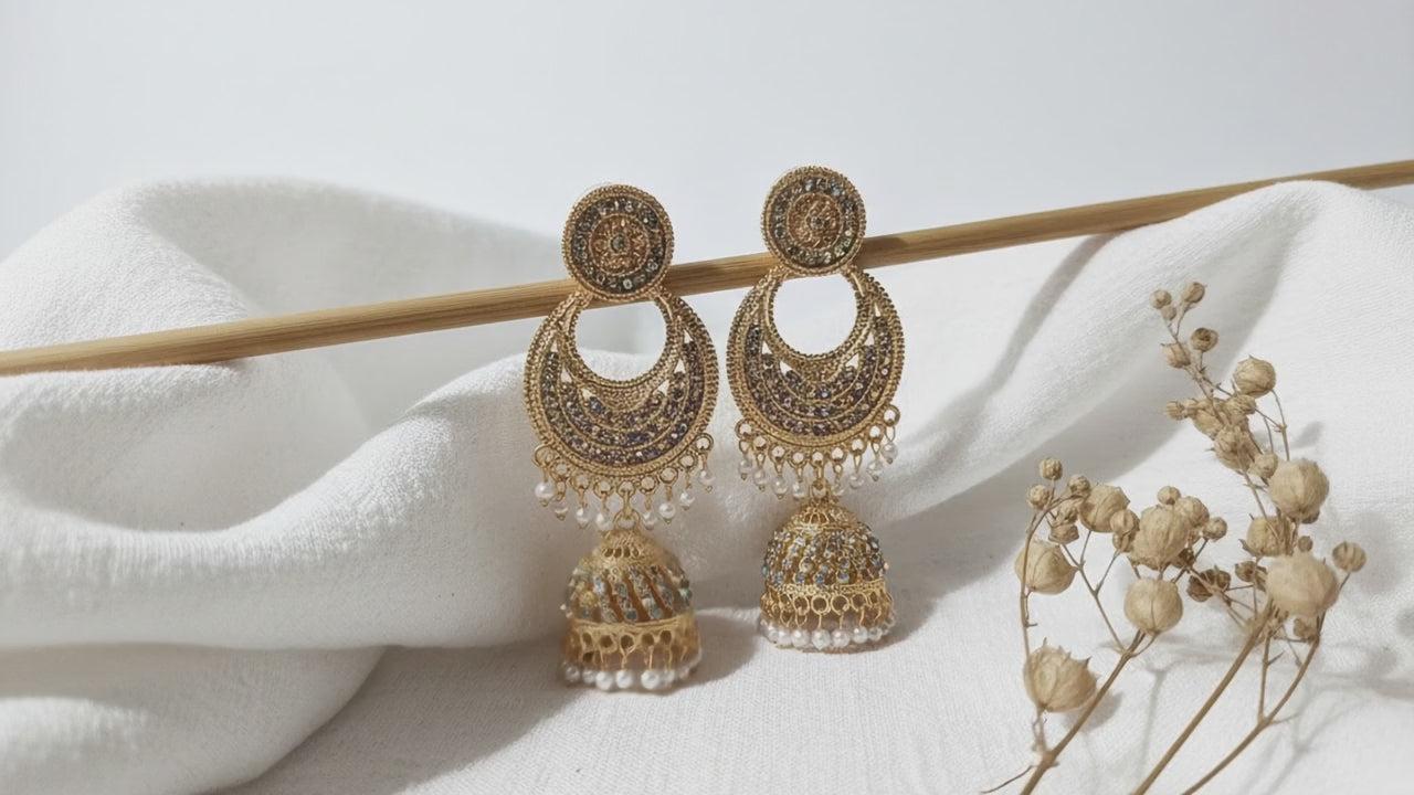 These magnificent earrings are the perfect blend of the popular Chandbali (crescent moon) and Jhumka (bell-shaped) styles, ideal for any ethnic or festive occasion.